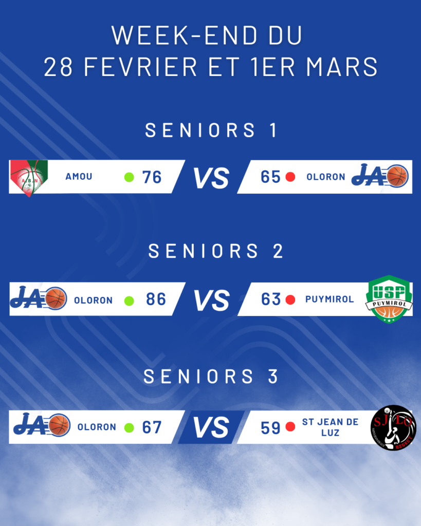 Les oloronais jouent les yeux dans les yeux avec le leader et grimpent le curseur défensif. Rey Bleu et Goussies ont la main chaude, les intérieurs Ngom et Chicot alimentent le score et la JAO inflige un 9-2 à des locaux qui commencent à douter (48-48/27’). Les fautes oloronaises profitent aux amollois qui inscrivent 8 lancers francs consécutifs pour rester aux commandes (52-50/29’). A l’entame du dernier quart-temps, les bleus sont toujours dans le coup (55-52/31’) mais le duo Marguerite/Labaigt réalise un nouveau break (62-52/33’) suivi par la paire d’intérieurs Ausina/Ndongala qui permet aux locaux de se mettre à l’abri (70-54/35’). Les bleus ne vont rien lâcher défensivement et malgré quelques approximations offensives vont terminer cette rencontre positivement. La JAO s’incline finalement 76-65 et doit maintenant se préparer à la réception de Urcuit, Samedi prochain, dans le cadre d’un derby basco-béarnais qui devrait attirer la grande foule à Scohy.